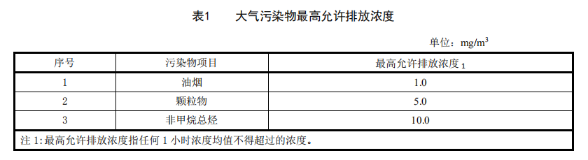 4.1.1 自本標準實施之日起,餐飲服務單位排放的油煙、顆粒物的最高允許排放濃度,應符合表 1 的規