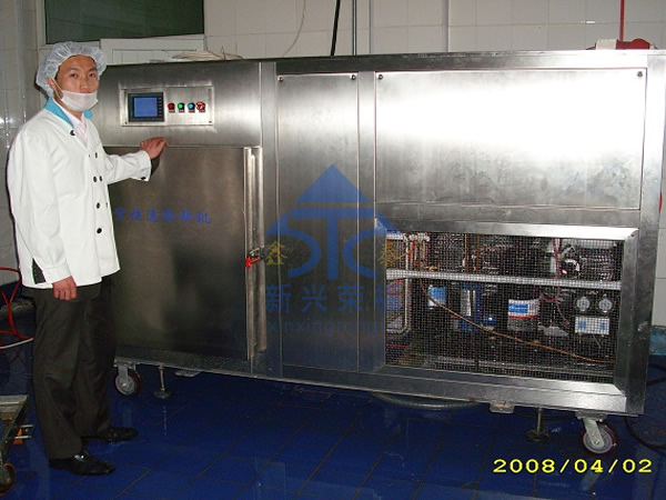 2、用強冷風冷卻(冷卻隧道),時間可縮短,但中心溫度仍下降緩慢,自然冷卻的缺陷仍然存在,冷卻不均勻導致食品外冷內熱,大大降低了食品的風味。使用強冷風冷卻的另一個很大缺陷就是能源消耗很大。真空冷卻的迅速降溫,阻止了食品因本身加工完畢后自身余熱的作用造成的過度熟化,過度熟化會讓食品失去本身的特殊香味。(例如,炒制的綠葉菜,如不經過20分鐘內迅速的降溫,那么它將會褐變,顏色不再鮮艷)